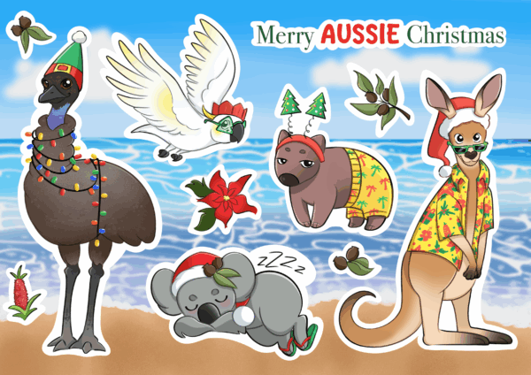 This sticker sheet features classic Australian animals in fun Christmas attire! This product was designed, drawn, and printed by Mjoy.