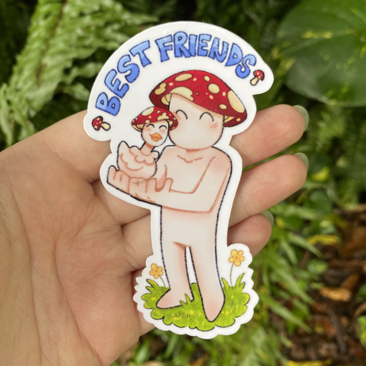 These stickers are all drawn, designed and printed by me. They can be used to decorate your journal, sketchbook, laptop, and anything else you want to customise. They’re printed on sticker paper with a water-resistant laminate, so they’re tough, but remember to treat them with a little love! 💕 Sticker sizes: ‘Mushroom Guy’- 7.8 x 8 cm; ‘Mushroom Duck’- 6.5 x 7.8 cm; ‘Best Friends’- 6.7 x 11.2 cm.